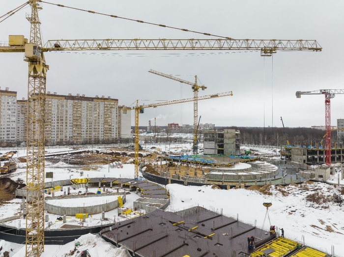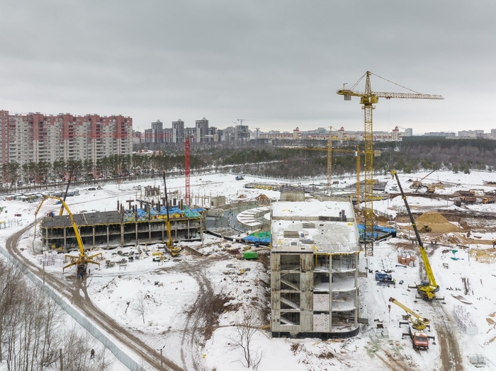 Фундаменты 7 блоков зданий готовы, строители начинают возводить стены и делать перекрытия. Земельные работы идут по двум спортивным блокам. Готова котельная, осталось провести наладочные работы. В апреле начнется возведение инженерных сетей.