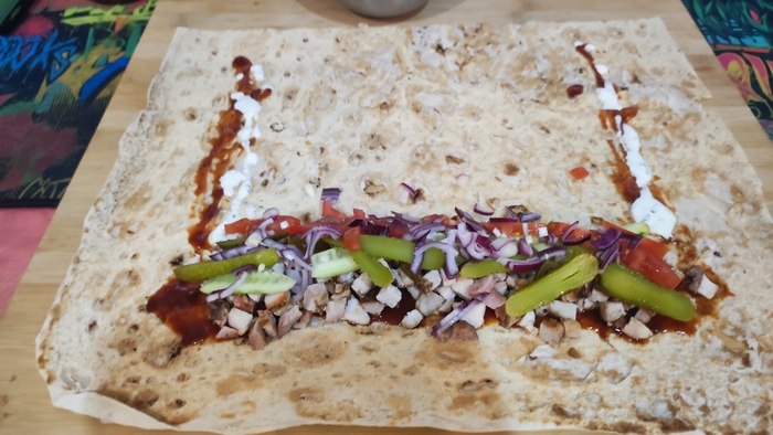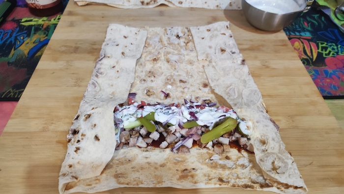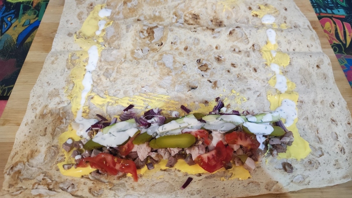 Для экспериментов над своим вкусом в 2 половины лаваша можно положить 2 варианта начинки и соусов. Как в subway, ну вы поняли.