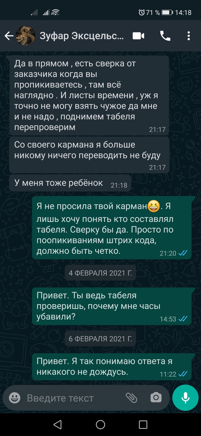 в голосовом он сказал "вечно у тебя что-то не так...пришлю табель" (потому что другие забивают в итоге на всё)