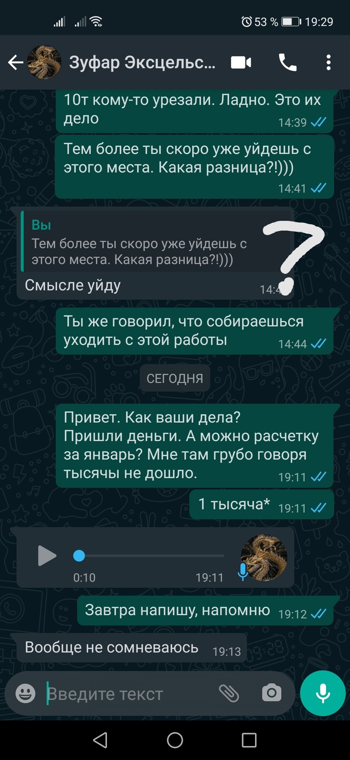 В этом же разговоре он как то мне "по секрету" рассказал, что ему тоже не доплачивают, (последние 500₽ в кармане😆) и собирается увольняться...