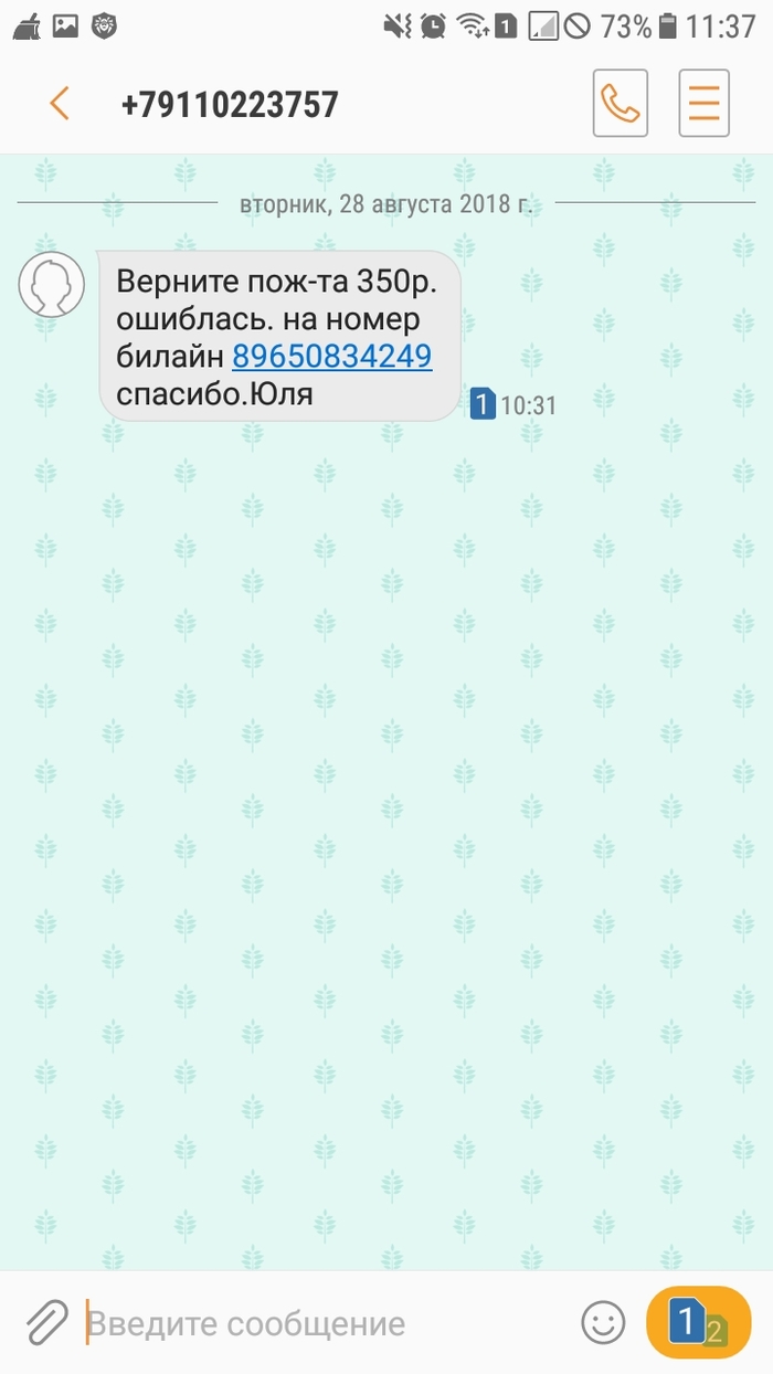 Друзья,будьте внимательны!возобновились случаи мошенничества,связанных с оплатой телефона. Пришла сегодня одна смска- поступил платеж на 350руб. Но внимание-не с телефонного оператора,а с какого то левого телефона. А следом вторая-просьба вернуть бабосики..