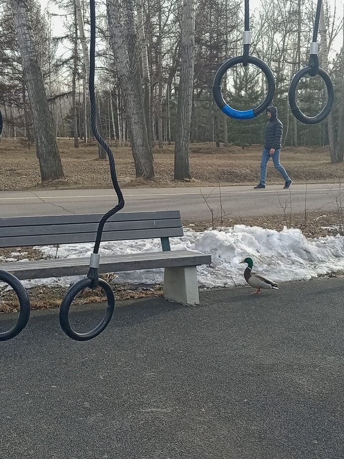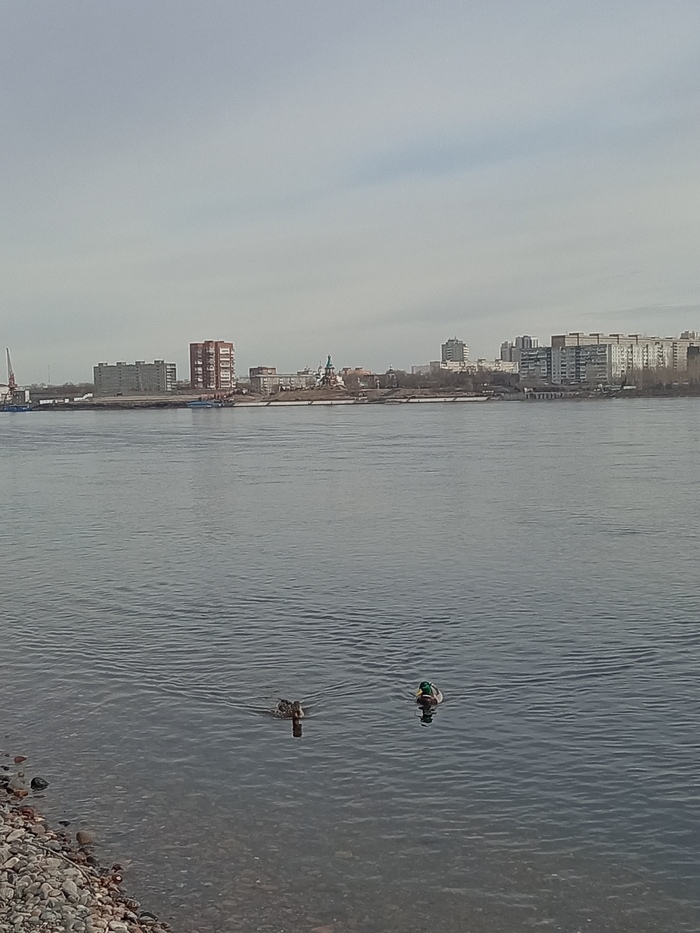 Дальше свернула за мостом направо и вышла к Енисею. Тут уточки уединились. А на том берегу видна церковь за торговым центром Красноярье. Тут мы уже были.