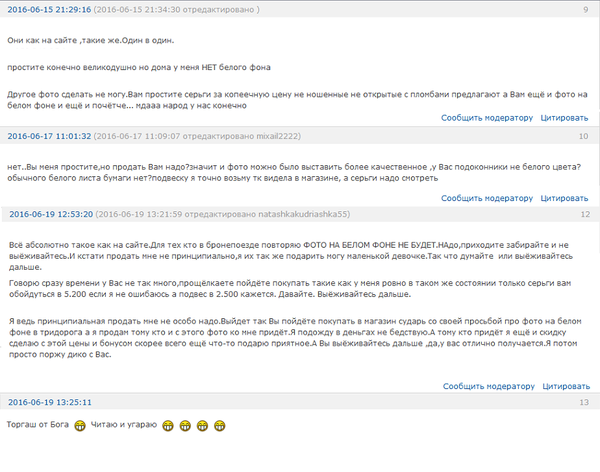 Наткнулась на следующую переписку о продаже ювелирных изделий на одном сайте, и не могла удержаться от смеха. Суть в следующем - дама продает серьги и подвеску по бросовой цене, но фото не особо качественное, и потенциальный покупатель просит сделать фото сережек на белом фоне. Далее происходит следующий диалог: