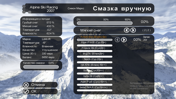 От автоматической смазки отказалась: как-то очень давно так сделала, и выдало мне данное творение игроинструдии смесь с 30% качества. Какая-то ерунда. С такой смесью, не то, что выиграть, в двадцатку со скрыпом, особенно на слаломе или супергиганте (про кажущуюся лёгкость оного я, может быть, когда-нить расскажу), не заедешь.