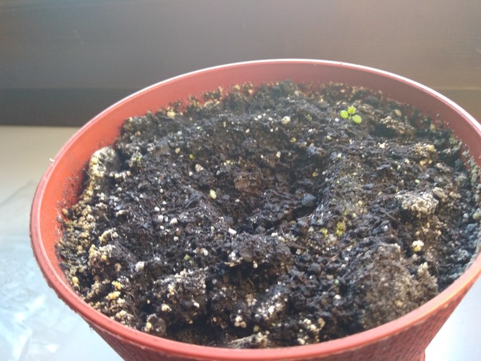Подарила мне коллега на новый год семена декоративного перца чили (два в пакетике). Ну я и посадил в начале марта. Первое семечко посадил в грунт, который шел в комплекте, а второе в свой, с балкона (который там до этого семь лет лежал). Сделал теплицу из полиэтиленового пакета и стал ждать. Первый перчик взошел быстро. (прошу прощения - тапок снимает плохо):