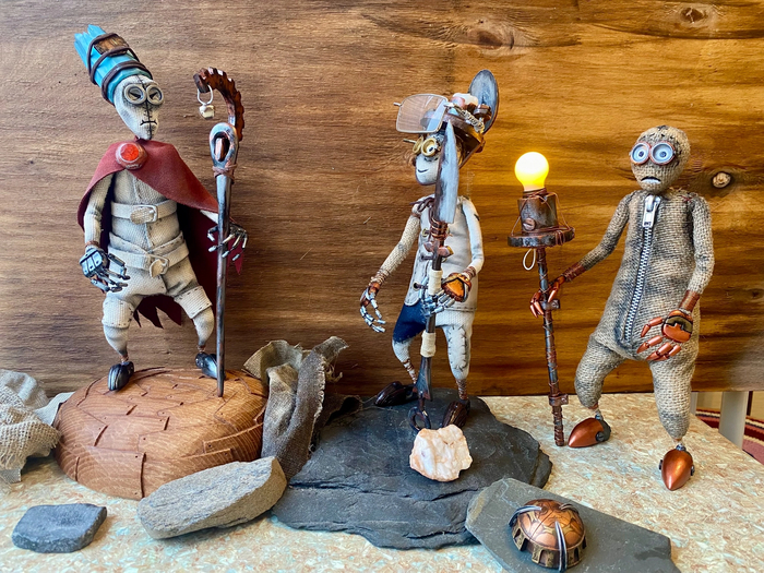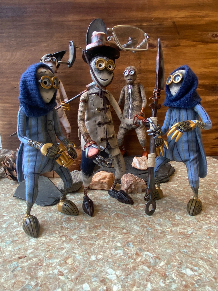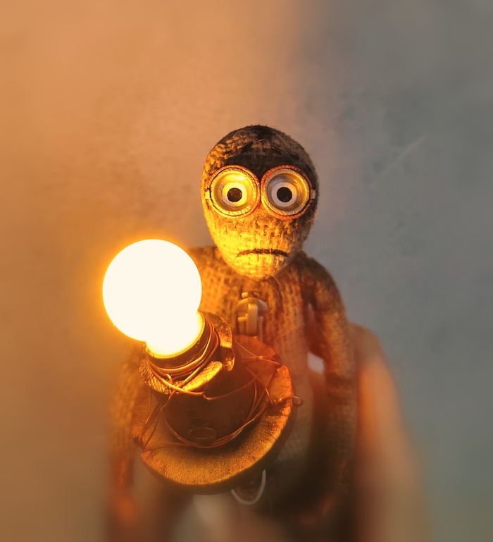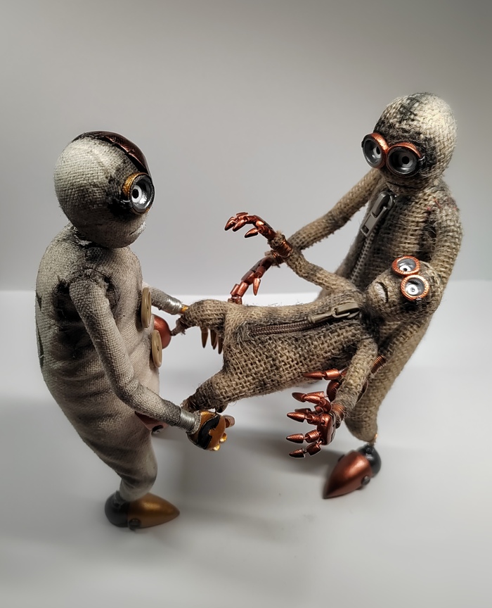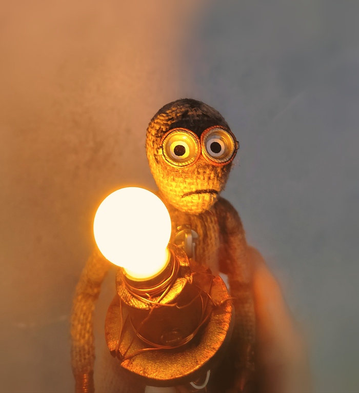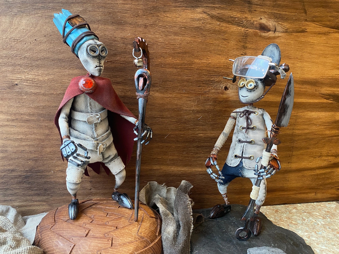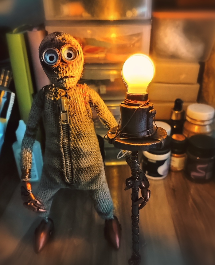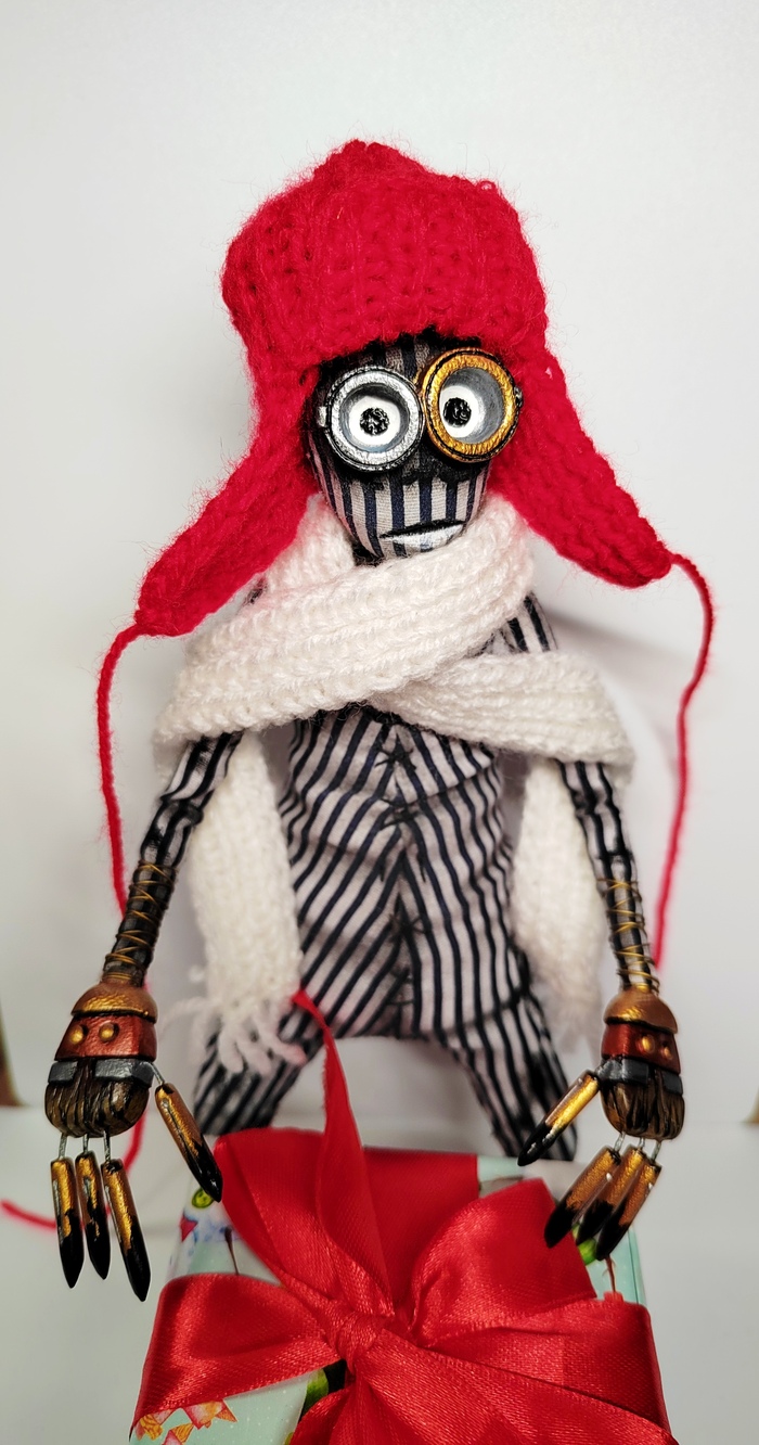 Выполнен в смешанной технике. Рост 23см. На шее носит ключ. Части тела из полимерной глины. Материал: проволока, пряжа, синтепон, полимерная глина, акрил, пастель лак, ткань. Фигурка подвижная.