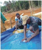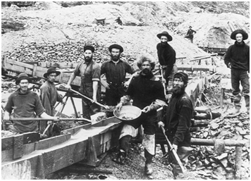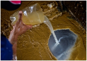 (Работники смешивают золотые пески с ртутью и собирают амальгаму)