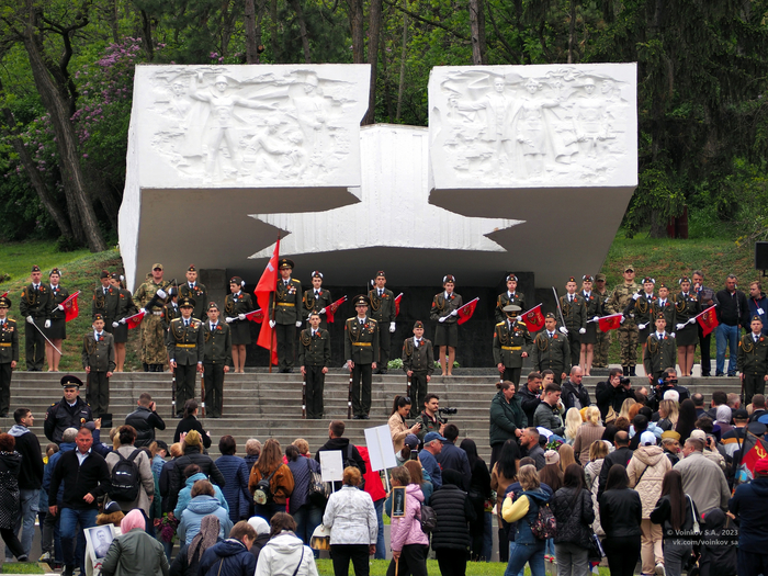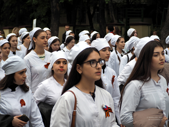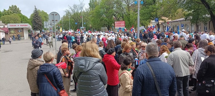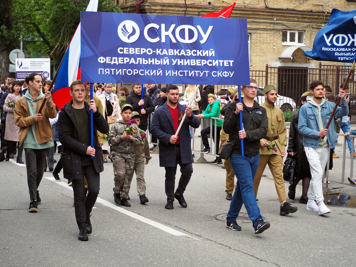 Я был на небольшом числе парадов Победы, но даже такого опыта мне хватило, чтобы понять, что пятигорский — необычный. Тут, помимо привычных людей в военной форме и т.п., были люди…Другие. Всякие другие. Разные. Очень разные. Разнообразие людей в толпе походило скорей на какой-то творческий фестиваль, чем на парад Победы: актёры в костюмах разных дружественных народов (украинцев не нашлось..), люди в белом, люди с баянами, люди в простом...ээ...штатском, в пиджаках, в шортах…