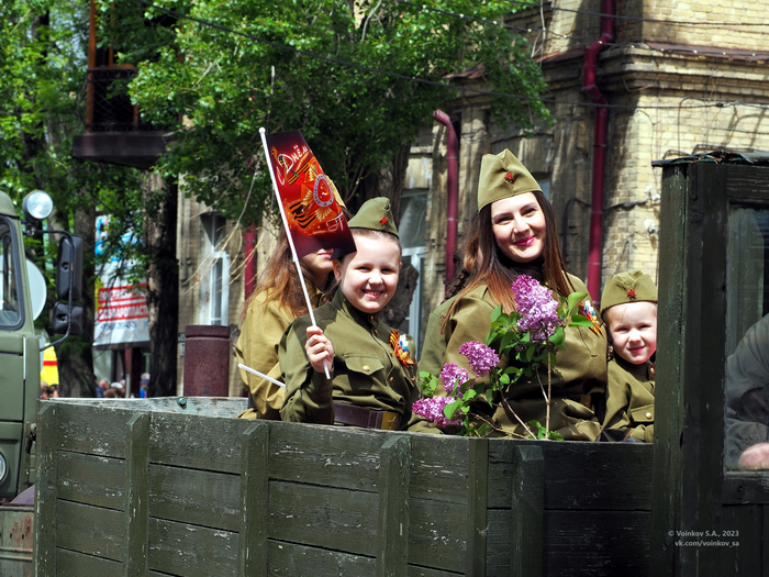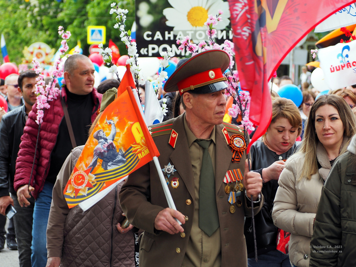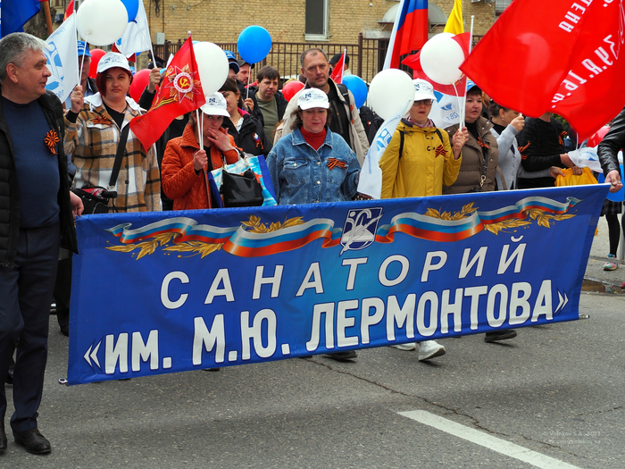 Если на парадах, которые я видел ранее (в других городах) участники так или иначе относились к событиям войны, то тут шли все: сперва, да, всякие кадетские корпуса и условно-военная техника, но потом пошли коллективы санаториев, и не только тех, которые существовали в 40-ых, но и новых. После же и вовсе в парадной колонне пошли студенты и представители местных бизнесов, а ещё коммунальные службы (местный водоканал и энергетики как минимум). Каким образом тут причастны, например, производители местного мороженного — я не понял :) . Но забавно.