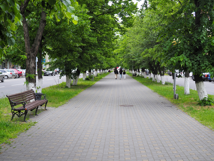 Вот тут гулять уже было гораздо приятней: между автодорог на довольно большой части улицы организована пешеходная зона с деревьями и лавочками. Шум от проезжающих машин не то чтобы сильно даёт расслабиться и отвлечься, но всё равно сильно лучше, чем простой тротуар. И, что важно, лавочек в достаточном количестве!