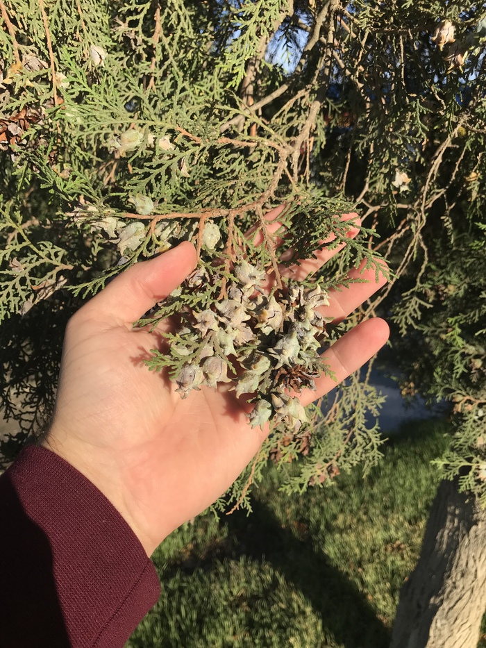1) Находим взрослую тую. Ищем такую, на которой будут шишечки. (как оказалось, шишечки образуются не каждый год; в прошлом году было очень трудно найти дерево с "икрой", зато в этом семена почти на каждом)