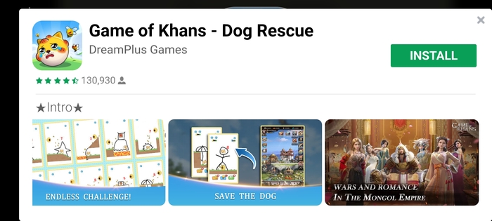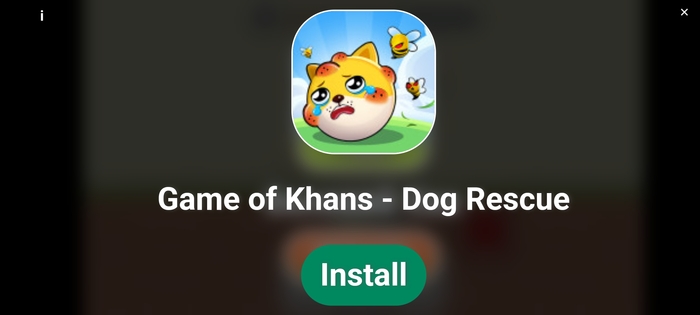 В самой рекламе была игра, где нужно было рисовать препятствия для пчел и спасти собачку. Ок, почему нет. Но я увидел название, и подумал, что им вообще все равно, как их игры называются. Причем тут Хан? Игра Ханов - спасение собаки... хех))