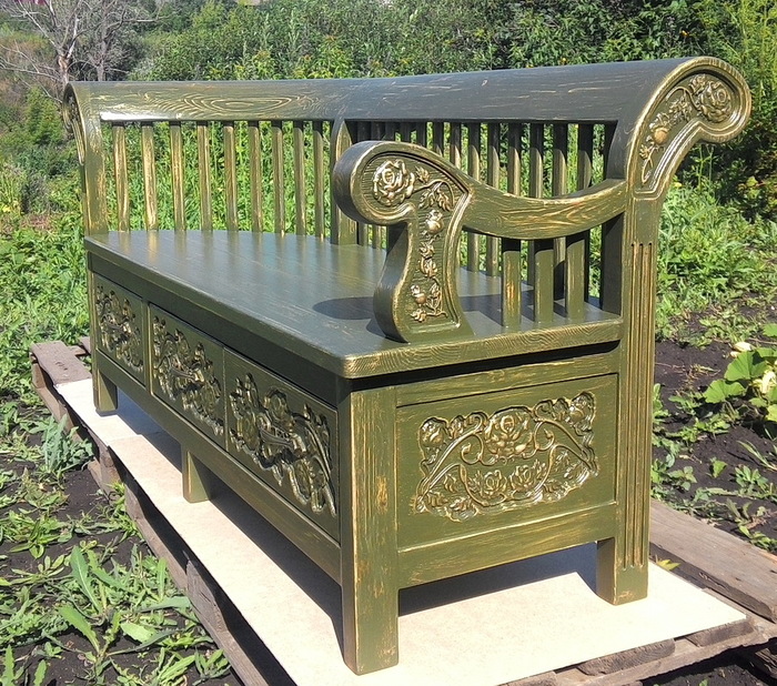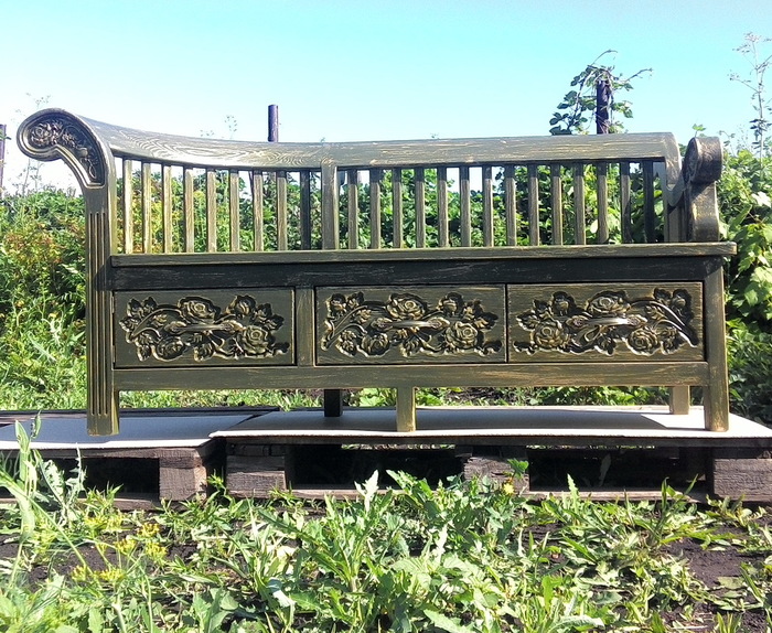 В прошлом году мы делали золотой комод - именно золотой, точнее окрашенный золотой эмалью - тут все как положено - и металлический блеск, и золотистый цвет - не яркий, не бледный - в самый раз.