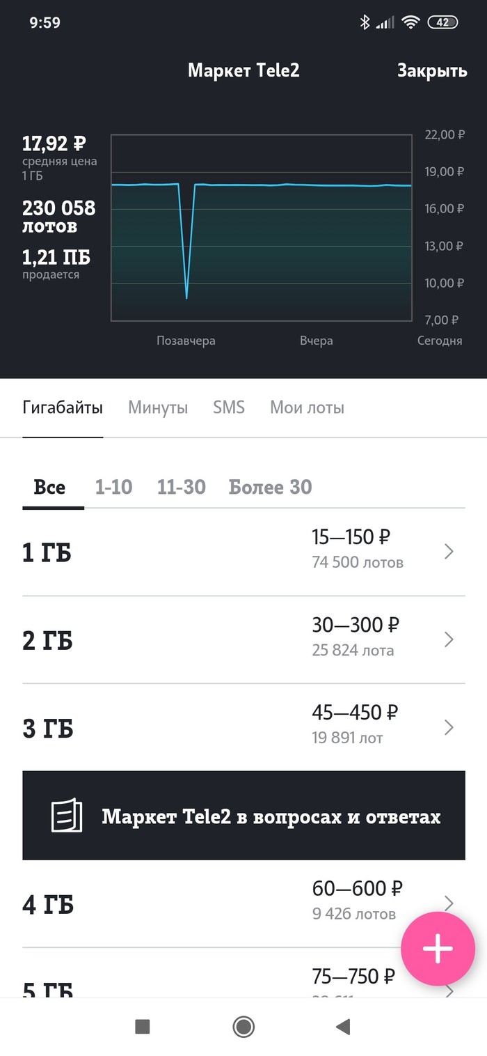 Интерсно, для чего стоят ограничения на минимальную сумму продажи? Я хочу выставить, допустим, не нужный мне интернет за бесценок, так зачем меня ограничивать?) Однако как мы видим из графика приложения сумма лота бываем и меньше 15 р за гиг. Теле 2 придумало биржу и не дает на ней продавать , вероятно вбрасывая свои дешевые лоты.