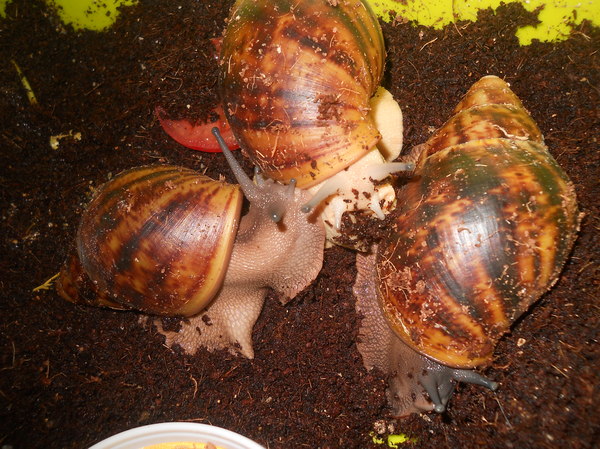 Все три архахатины одной кладки, с хорошими генами-альбинос самый жирный, размер от 8 до 12см(еще растут-всем по пол года)