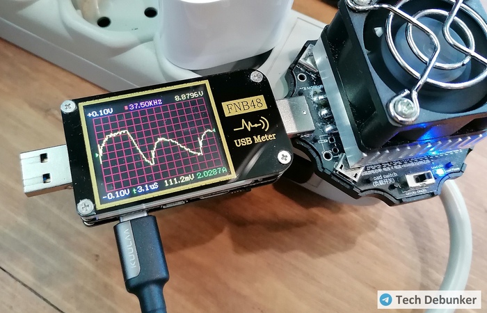 Опять же, сведущие подметят, что тестер подключен через кабель, на котором с токами в 3 А должна быть просадка. И она есть. Тут использовался один из лучших недорогих кабелей Kuula Z1 100W длиной 0,5 м, на котором идет минимальное падение из всех протестированных мною кабелей в 0,11 В на 1 А.