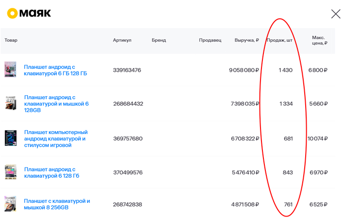 Статистика одной из топовых позиций показывает, что по 4 тыс. руб. в день уходило 20-30 шт. Потом цену подняли до 7 тыс. – продажи вырасти до 60-100 шт. Ну а когда на остатки выставили 67 тыс., все равно заказывали по 8-9 шт. ежедневно. И это за набор с ценой в оптовых поставках ~1-3 тыс. руб. Этот пример показан на скриншоте со статистикой из сторонней аналитической системы «Маяк». Впрочем, «Маяк» мог принять списание каких-то остатков на стороне продавца за реальные продажи. И точно ответить на этот вопрос сможет только продавец подделок.