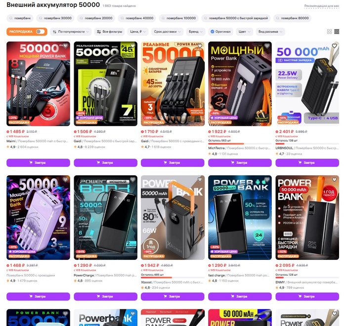 Например, если в поиске набрать «внешний аккумулятор», то в первой сотне на WB мне вываливается 54 фейка, на Ozon – 28. Если сделать сортировку по цене, то фейков становится уже ~80-90%. А если добавить к запросу, например, цифру «50000», то фейков на WB будет ровно 99 из 100.
