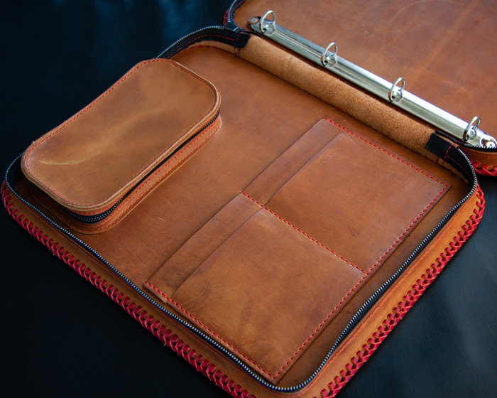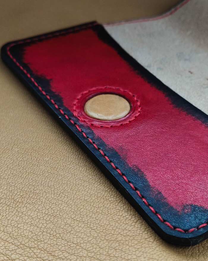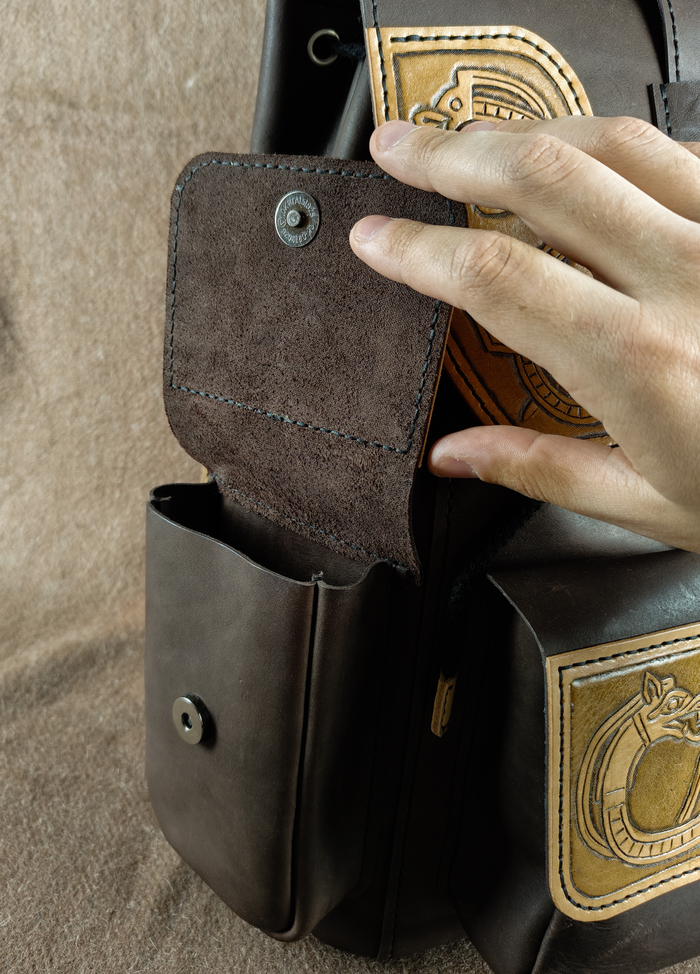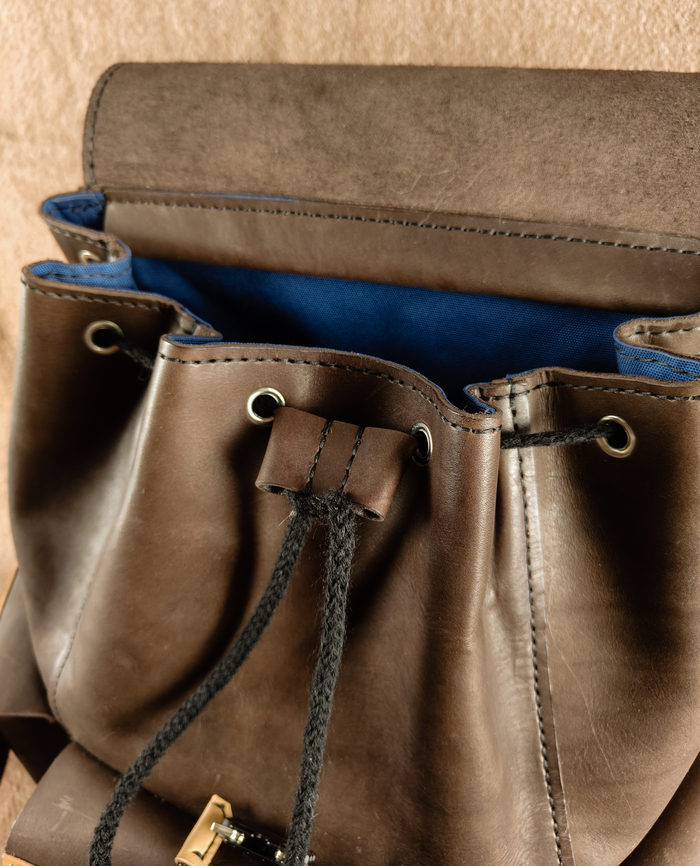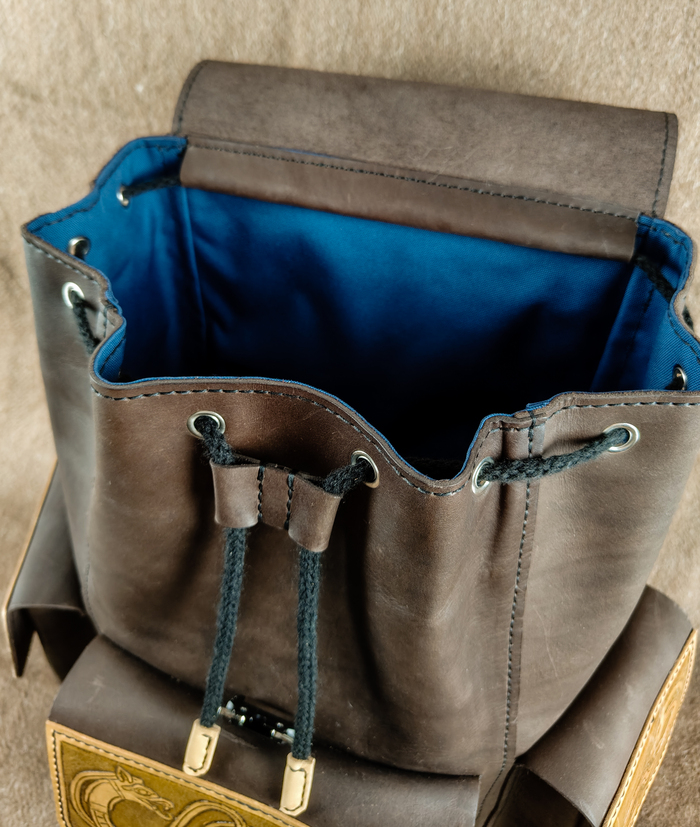 Карманы закрываются на магнитные кнопки. Основное отделение и лямки на пряжках "кобра". В основном отделении тканевая подкладка. Все кроме подкладки сшито вручную)