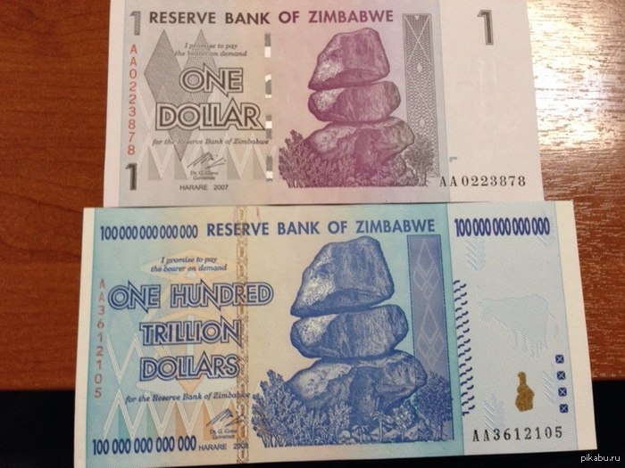 90 Lilusch Инфляция 12 лет назад Валюта Зимбабве.1 доллар и 1 доллар через 9 месяцев с учетом инфляции [моё] Банкноты Зимбабве