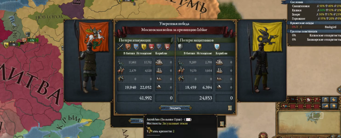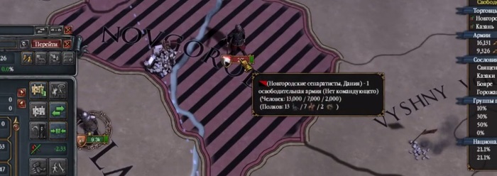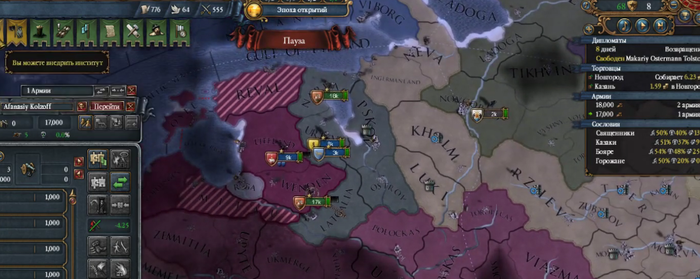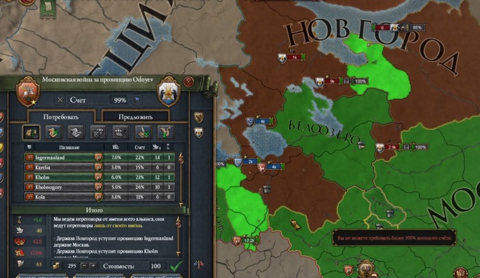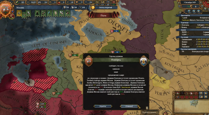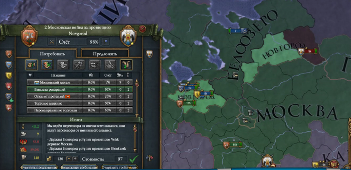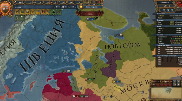 Первым делом снимаем с сословий все бонусы на очки и деньги. Строим армию до фула, что бы закрыть задание на завоевание Новгорода, получив вечные претензии на все новгородские провинции.