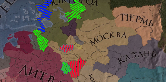 Синий - 3я война. Добираем остатки Карелии, что бы Новгород перестал граничить со Швецией. И еще провинции Белоозеру на севере. Кроме Колы, ее пускай забирает Дания. Будет повод потом напасть. А пока пускай мучается с лапландцами там.