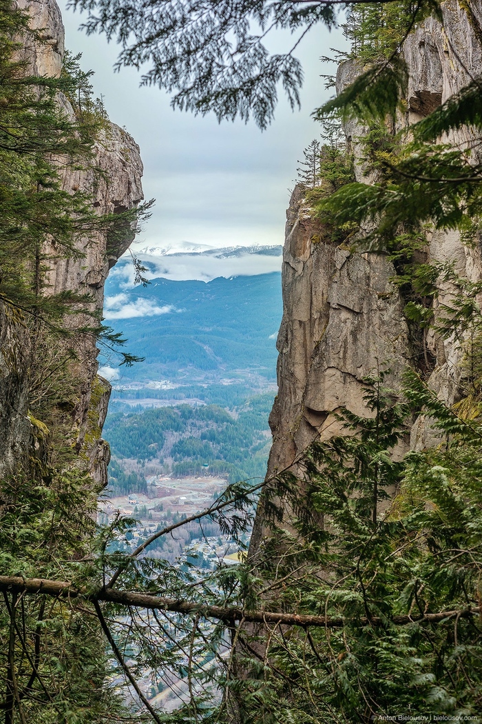 Между городом Ванкувер и городком Сквамиш, скорее уже почти в Сквамише, есть гора - кусок скалы под названием Чиф. Её облюбовали скалолазы - когда вы в машине проезжаете мимо горы, то всегда можете увидеть, в зависимости от сезона, от 2-3-х до 20-30-ти скалолазов и скалолазок, покоряющих ее склоны. Для туристов, а не скалолазов, есть тропа, по которой можно подняться на макушку горы и полюбоваться потрясающим видом. Но можно пойти и другим путём. Но уж если даже и так вам лень - лень идти вместе с автором видео, то на 3:46 он достает дрон и запускает его. И вот он этот обалденный вид, ради которого мы тащились сквозь дремучие дебри.