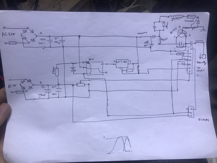 Нарисовал схему(не ругайте), но легче от этого не стало. Изначально грешил на обмотку трансформатора, так как при проверке ее через прибор(который еср измеряет, только прокаченный) она прозванивалась как резистор в 3-4 ома. Перемотал, ничего не поменялось. Высоковольтные конденсаторы заменил, вроде проверил все, что только можно проверить - но работать оно не хочет. На базе транзистора сигнала нет, как я понимаю, ее должна задавать lm317t(ошибаюсь, тут вроде лц генератор)