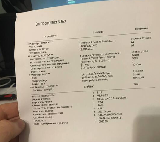 Есть монохромный лазерный принтер, Samsung SCX-4300, вроде как не прошитый, купленный с рук вместе с картриджем. Вот инфа с отчета: