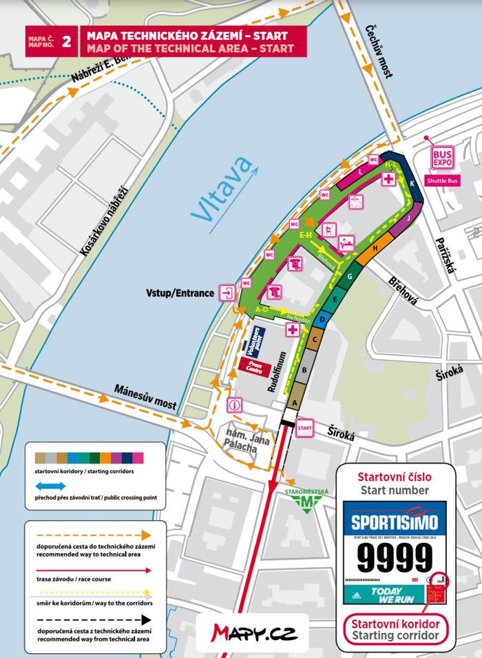 В день старта с погодой повезло - ясно, солнечно, прохладно, комфортно для бега. Точка старта и финиша - площадь Яна Палаха (Náměstí Jana Palacha). Стартовые коридоры были огорожены, разделены на 10 секторов - мой сектор был предпоследний. В техническую зону пропускали только участников забега по стартовому номеру (на картинке можно видеть вход, он обозначен как Vstup/Entrance). Внутри были раздевалки, камеры хранения, душевые, палатка гравировщика, бесплатное кинезиотейпирование, туалеты. МНОГО туалетов. К кабинкам не было километровых очередей, как это обычно было на всех трех полумарафонах в России, в которых довелось участвовать (Москва, Владивосток, Красноярск). Также не было очередей после финиша за вещами в камере хранения. НО была огромная очередь к гравировщику. Отстоять пришлось минут 15 точно.