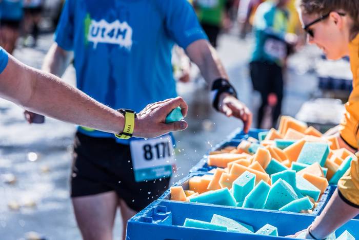 Пункт питания и пункт освежения примерно каждые 2,5-3 км. О том, что впереди пункт питания, можно узнать по столпотворению людей и куче стаканчиков на трассе. Всего было 6 пунктов, на каждом из которых была вода, изотоник, сахар, соль, бананы, апельсины, стояли огромные чаны с водой и губками. Столы были поставлены вдоль трассы, подбегать было удобно. Волонтеры протягивают стаканчики с питьем и мокрые губки бегунам, можно вообще не останавливаться, лишь замедлять темп.