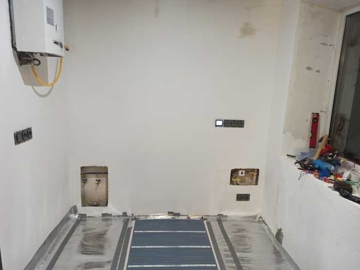 Когда появилось точное знание о том, где будет проходить штроба, где встанут подрозетники и куда сверлить дырки для кронштейна телевизора, от пола до потолка завешиваю пленкой часть стены, которая непременно пострадает. Вместе с этим накрываю пленкой мягкую мебель и технику, потому, что пыль найдет себе дорогу, как бы ты свое рабочее пространство не занавешивал.