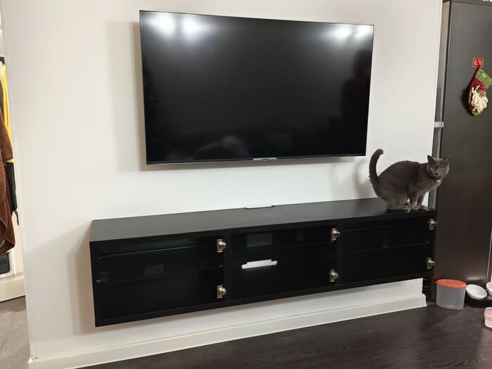 На кронштейне прикольные пластиковые накладки, внутри которых можно разместить провод, а на тумбе сидит кошка