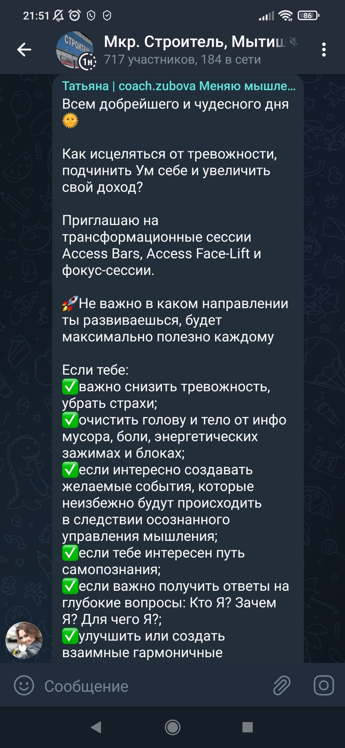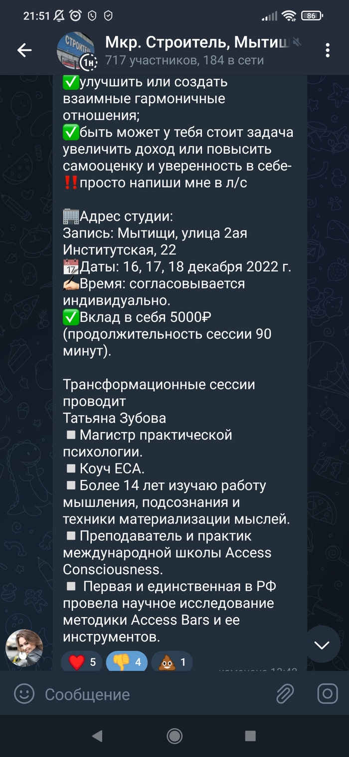 Сижу тут в местной районной группе в ТГ, читаю новости и тут добавляется барышня, которая предлагает такую услугу (скрин ниже прикрепляю). Больше всего из этого понравилось: "Вклад в себя 5000, техника материализации мыслей и первая и единственная в РФ "что-то там"... 😂