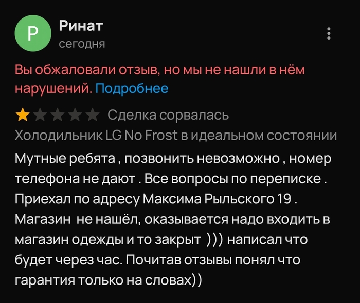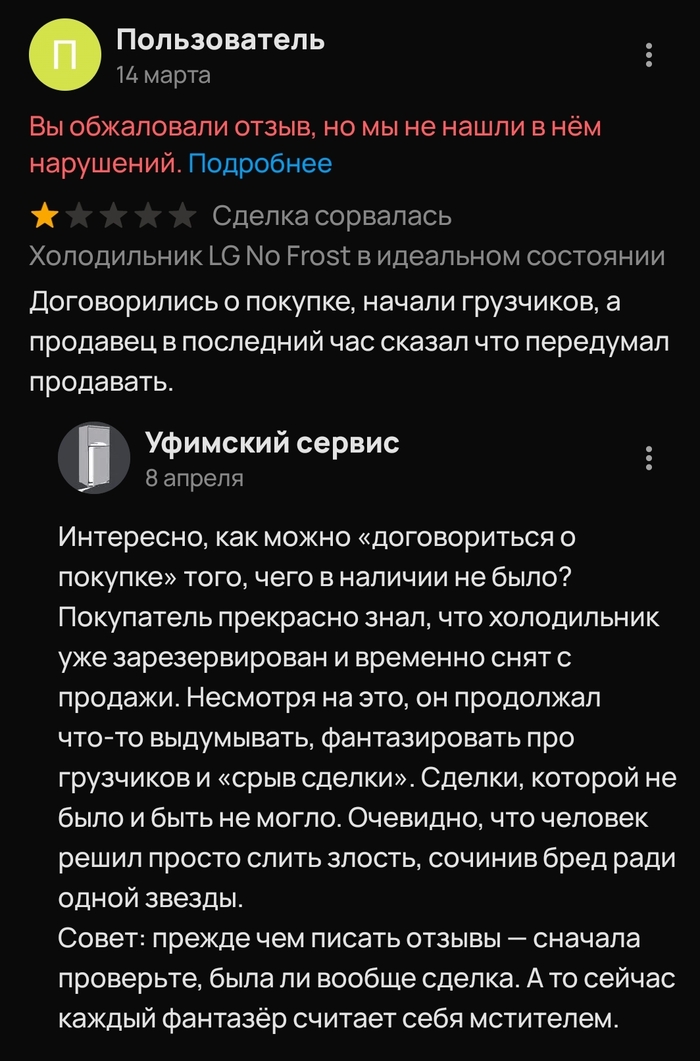 Пользователь оставил негативный отзыв о том, что якобы была достигнута договорённость о покупке холодильника, были вызваны грузчики, но продавец в последний момент отказался продавать товар. Однако переписка и фактические обстоятельства полностью опровергают данное утверждение.