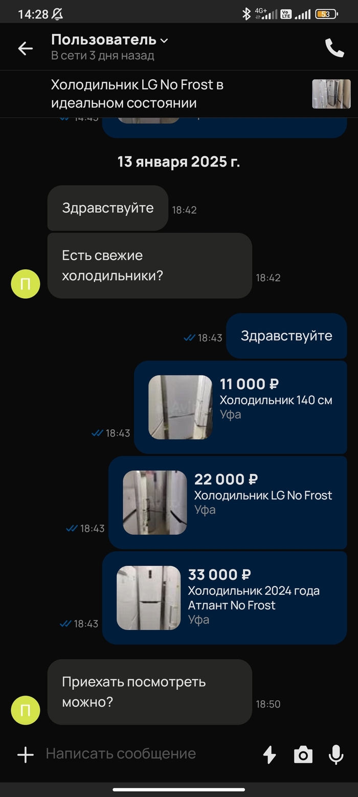 Пользователь снова интересуется свежими холодильниками. Продавец отправляет актуальные предложения. Пользователь спрашивает, можно ли приехать посмотреть, на что получает положительный ответ с указанием адреса и времени работы