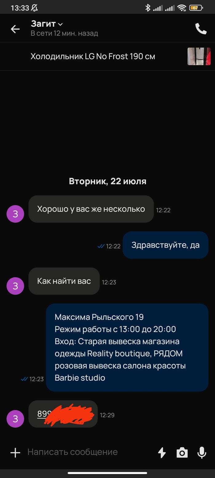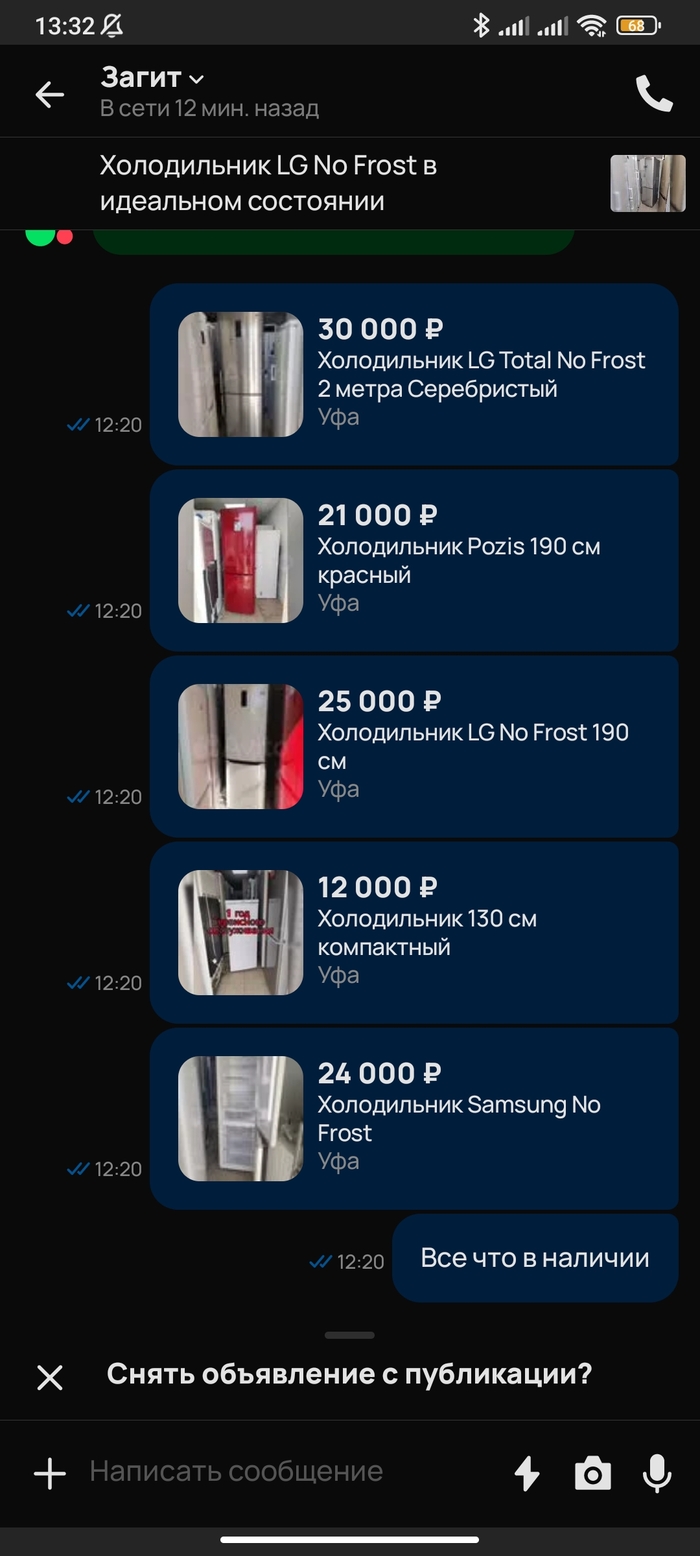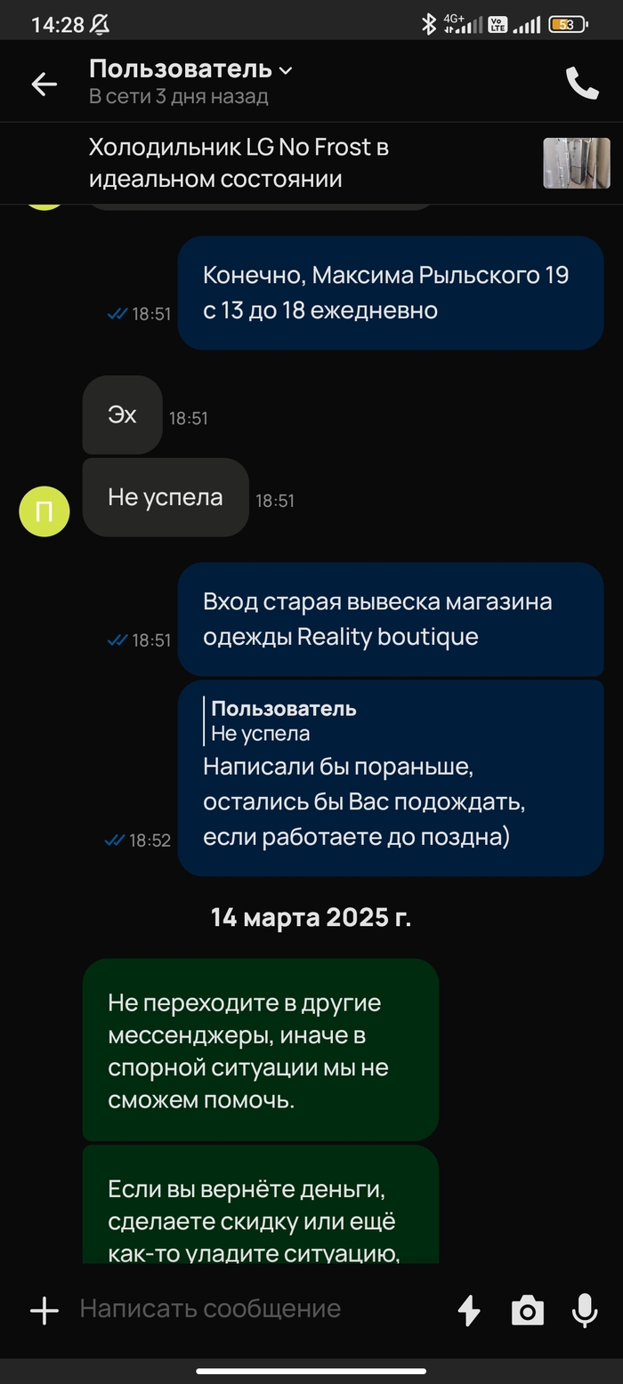 Пользователь интересовался холодильником LG No Frost. Продавец сразу сообщил, что данный холодильник уже продан, и предложил рассмотреть другие варианты. Пользователь сам предложил снять объявление, чтобы не беспокоить продавца по неактуальному товару.