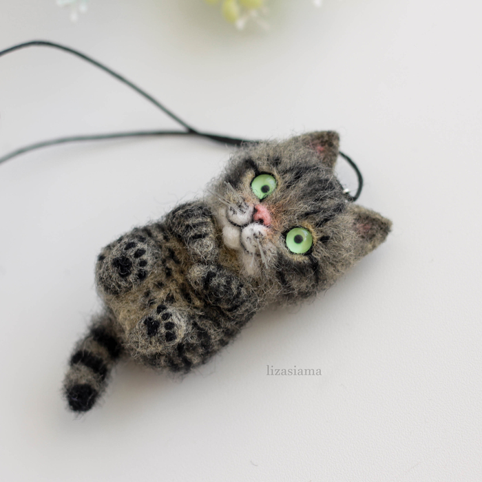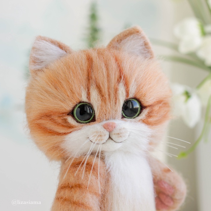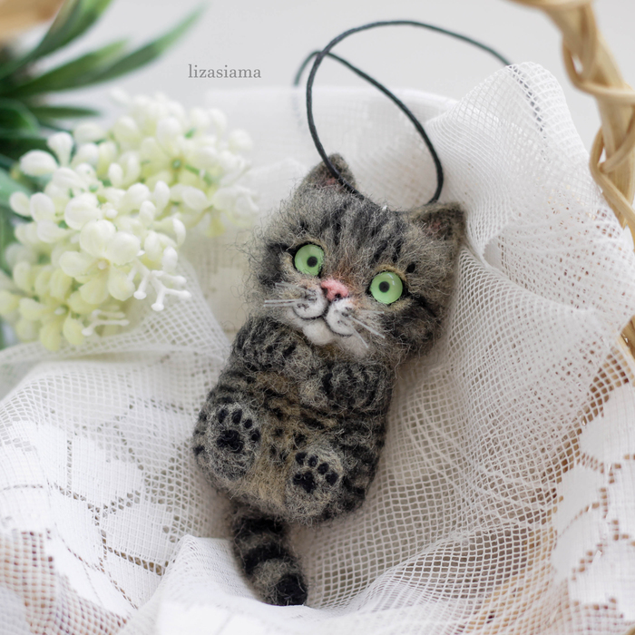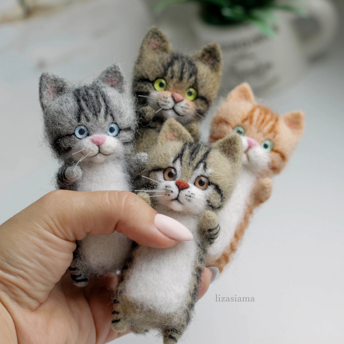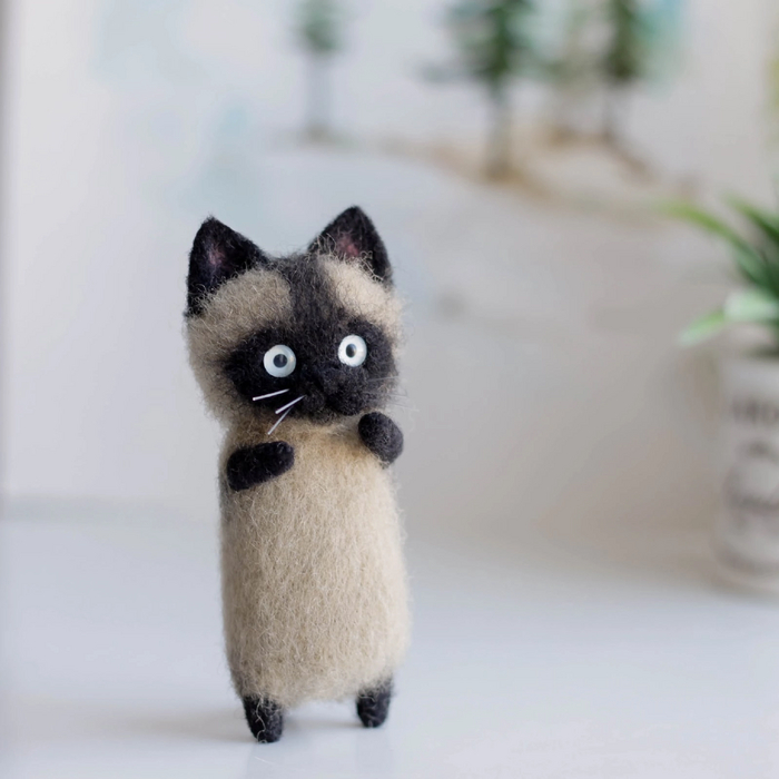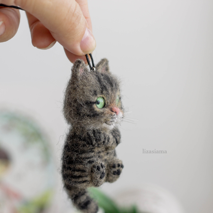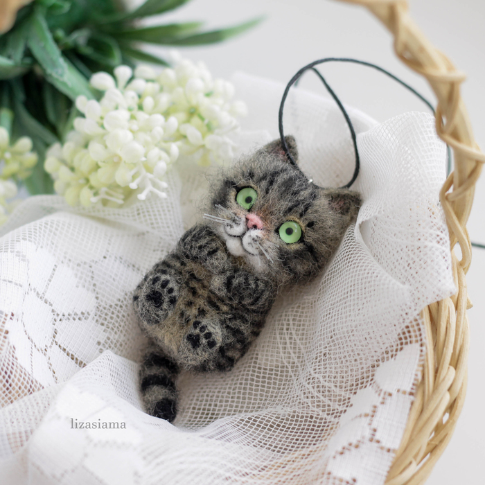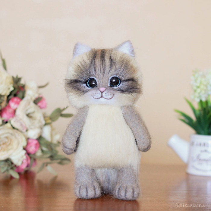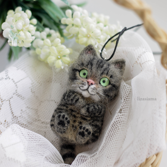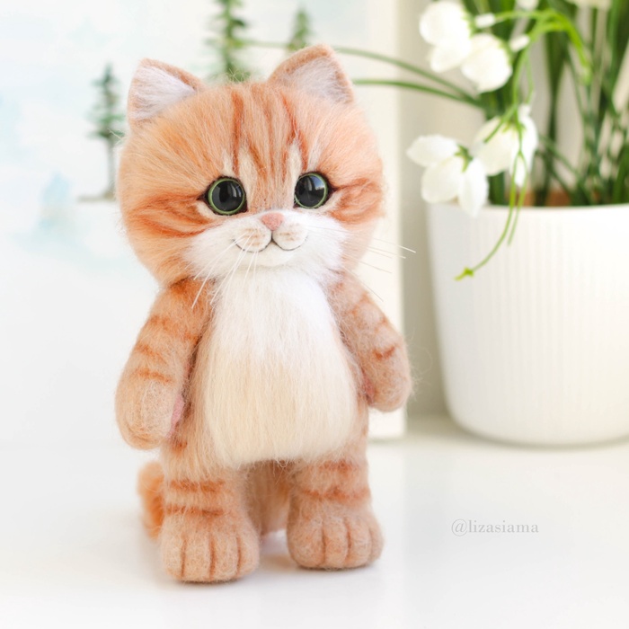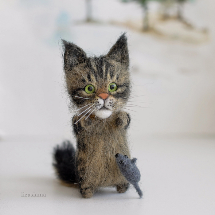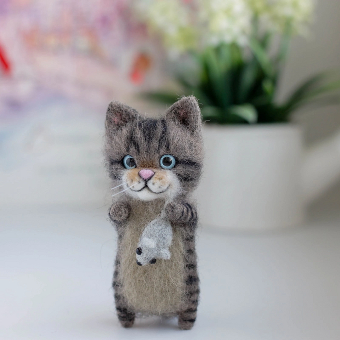 Котик создан в технике сухое валяние из овечьей шерсти. Высота 9 см. Лапы и хвост на проволочной основе. Глазки из стекла.