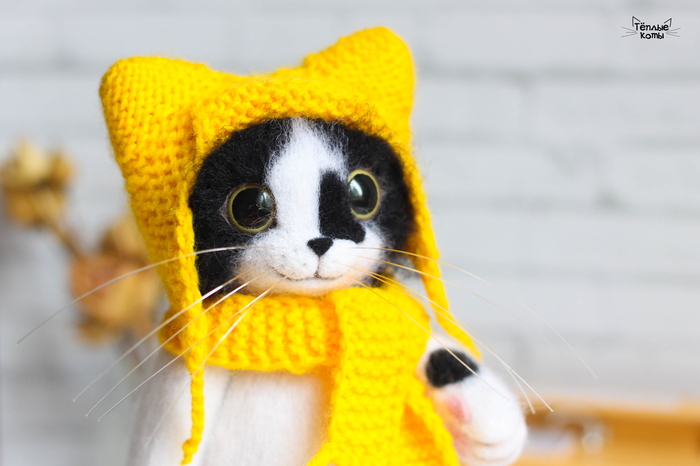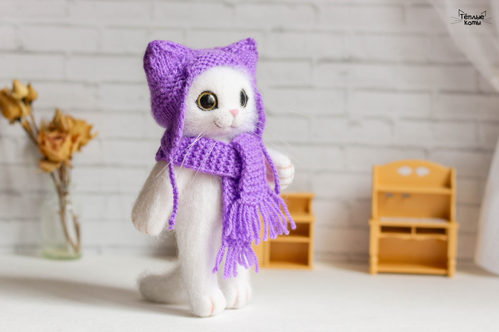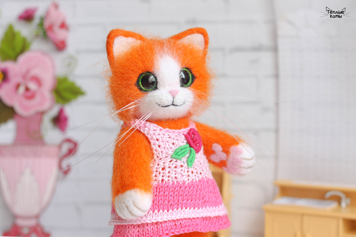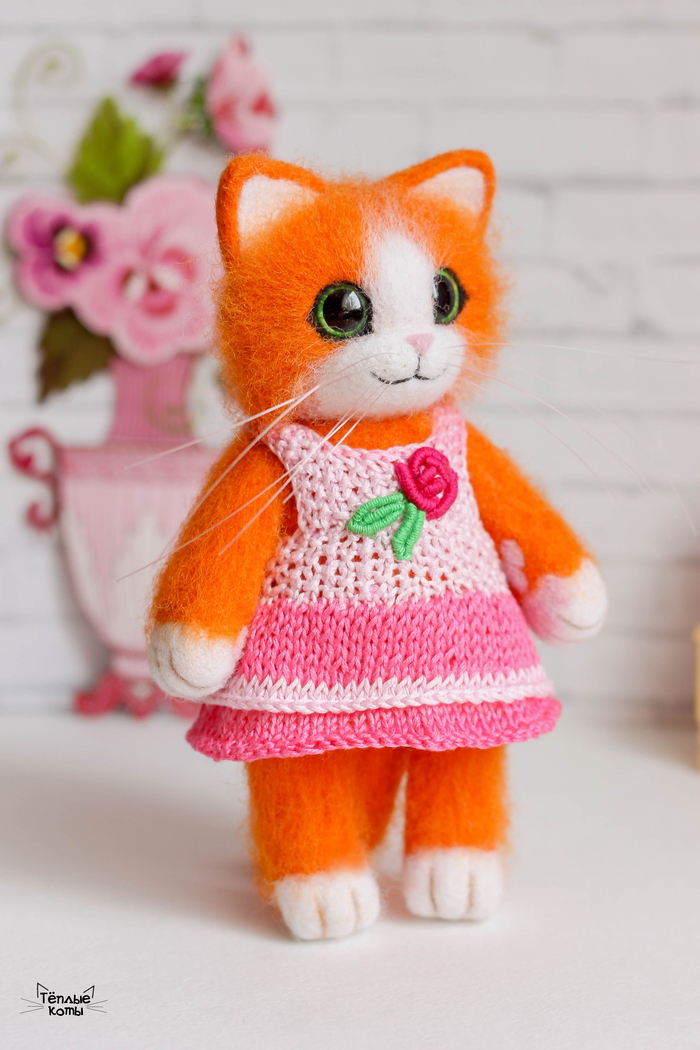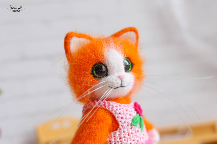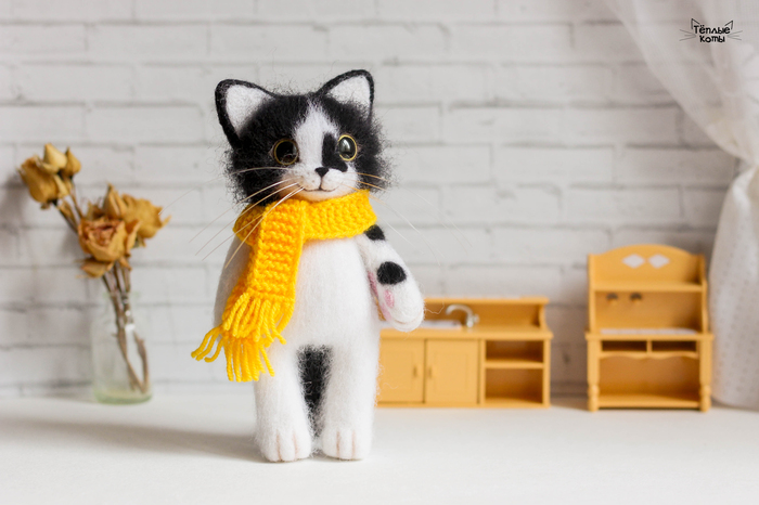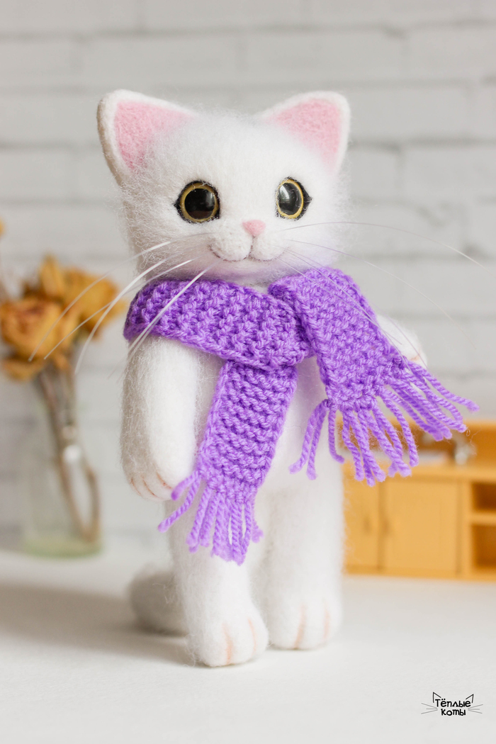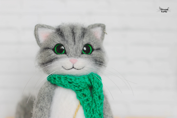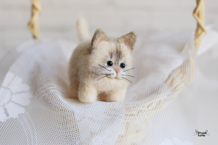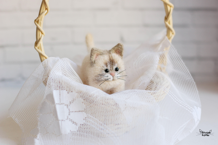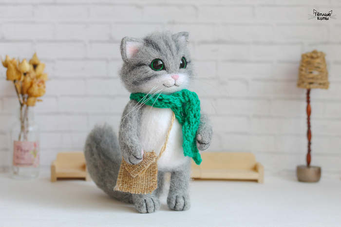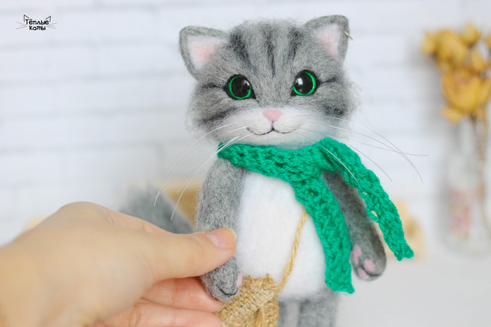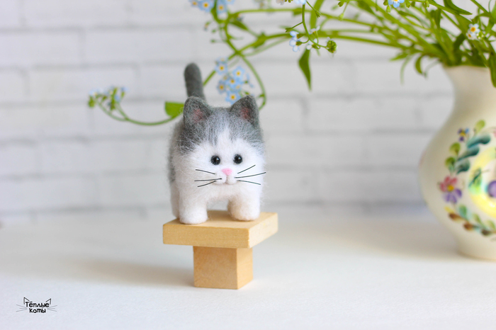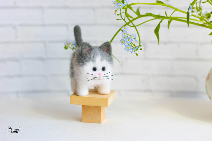 Немного расскажу про работу над этим котиком. Обычно делаю котиков из шерсти кардочёс, а потом обрабатываю обратной иголочкой для создания шёрстки. Этому котику решила попробовать сделать длинную шерстку, поэтому сначала сделала основу из кардочёса, а сверху гребенную ленту. Потом игрушка идет на стрижку и укладку =) И перед нами милый котей)