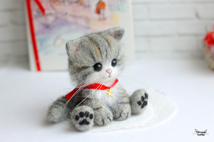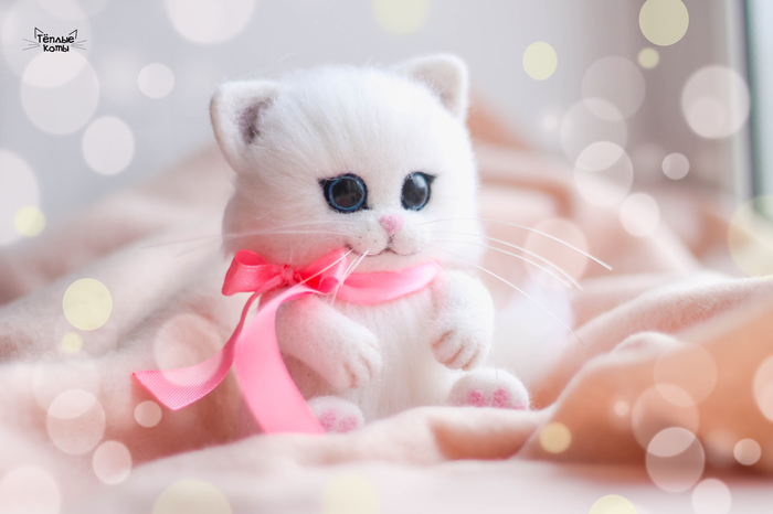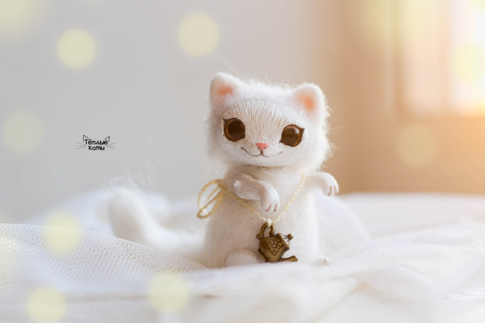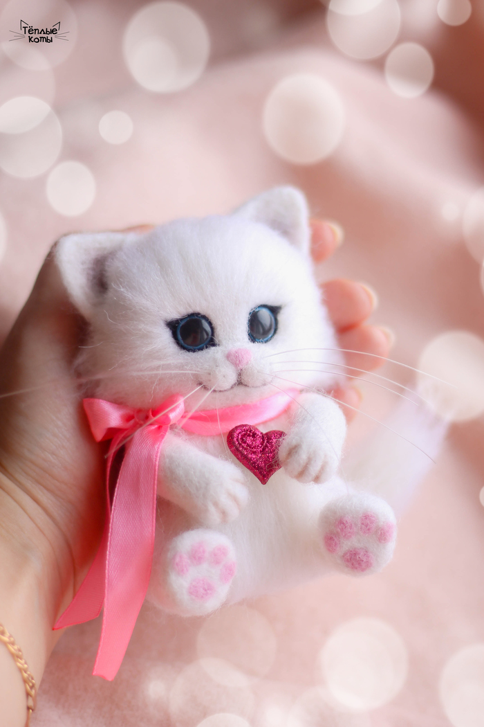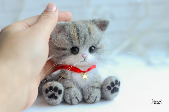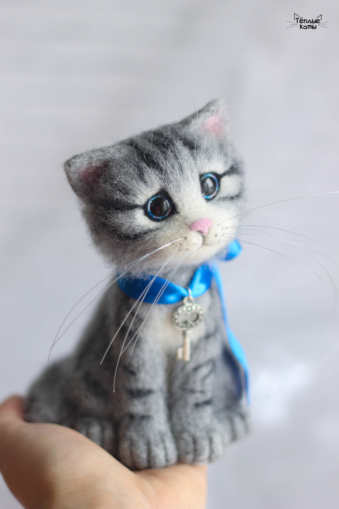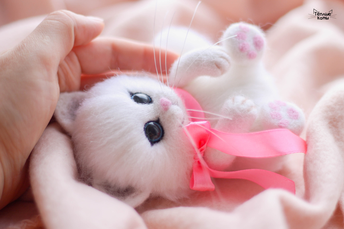 Всем привет! Расскажу немного о процессе. В работе над этой кошечкой было использовано два вида шерсти: кардочёс и гребенная лента. Кардочёс в основе, а гребенная лента сверху, она приваливается отдельными прядями по всей поверхности игрушки, что-то вроде наращивания))) Хоть это и трудоёмко, зато результат этого стоит, получилась красивая длинная и пушистая шёрстка)