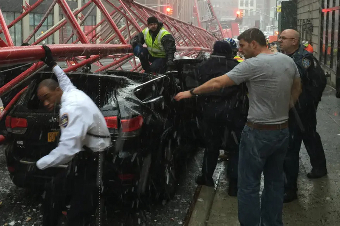 Строительный кран высотой почти 600 футов рухнул на здания, пешеходов и припаркованные машины вдоль улицы в центре Манхэттена в пятницу утром, убив математика с дипломом Гарварда по дороге на работу и ранив еще трех человек.