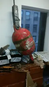 Во время спуска кран врезался в несколько зданий на Уорт-стрит, срезав полосу обломков. Его гигантский крюк врезался в офис Нью-Йоркской школы права.