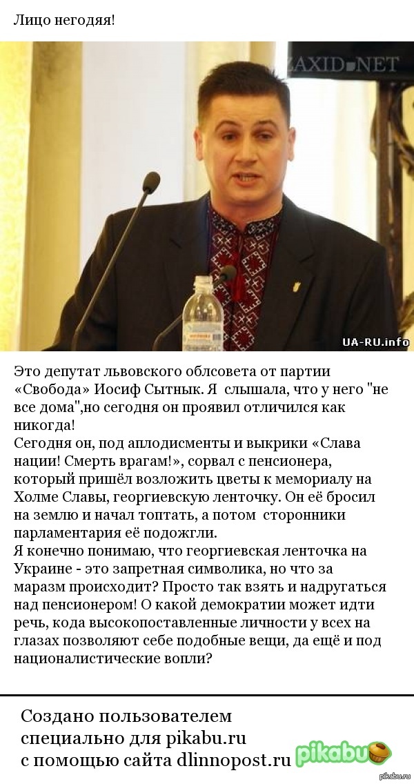 449 LolBanny Политика Иосиф Сытнык 10 лет назад Сразу пруф: http://www.vz.ru/news/2015/5/9/744475.html Политика Украина Львов 9 мая - День Победы Позор