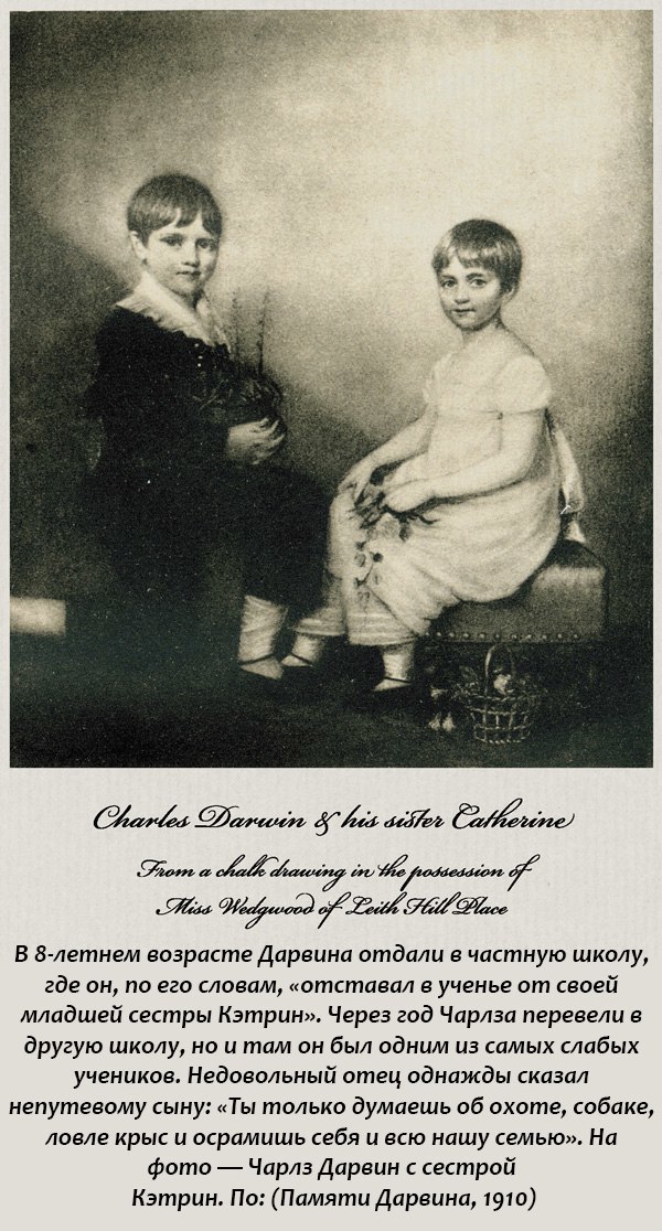 Успехами в школе Дарвин не блистал. В колледже дела также шли неважно, и в конце концов отец отправил его подальше — в Шотландию, где в октябре 1825 г. 16-летний юноша начал учиться на медицинском факультете Эдинбургского университета (такой выбор будущей специальности сына был неслучайным — его отец был преуспевающим врачом). Через два года стало ясно, что врача из Чарлза не получится. Последовал новый перевод — на этот раз в другой знаменитый университет, Кэмбриджский, но уже на богословский факультет. Об учебе там сам Чарлз вспоминал: «...время, которое я провел в Кэмбридже, было всерьез потеряно, и даже хуже, чем потеряно. Моя страсть к ружейной стрельбе и охоте ... привела меня в кружок ... молодых людей не очень высокой нравственности... Частенько мы пили не в меру, а затем следовали веселые песни и карты. ... Знаю, что мне следовало бы стыдиться проведенных таким образом дней и вечеров, но некоторые из моих друзей были такие милые малые, и всем нам было так весело, что я и теперь вспоминаю это время с удовольствием».