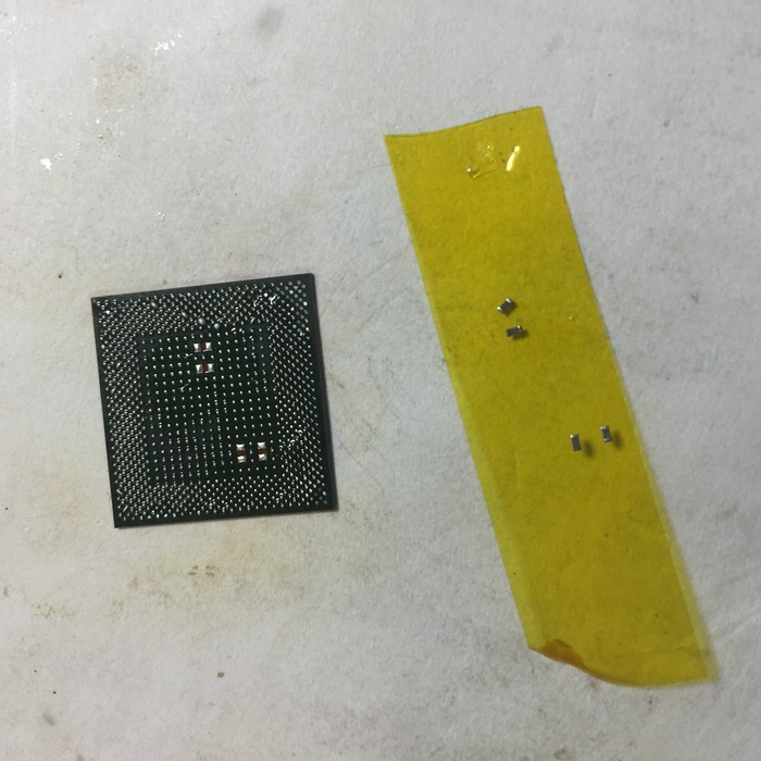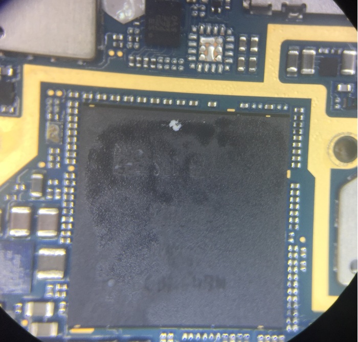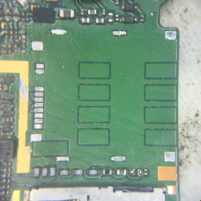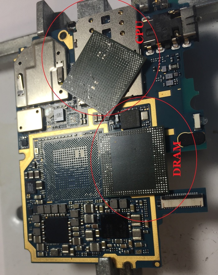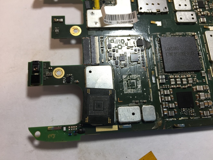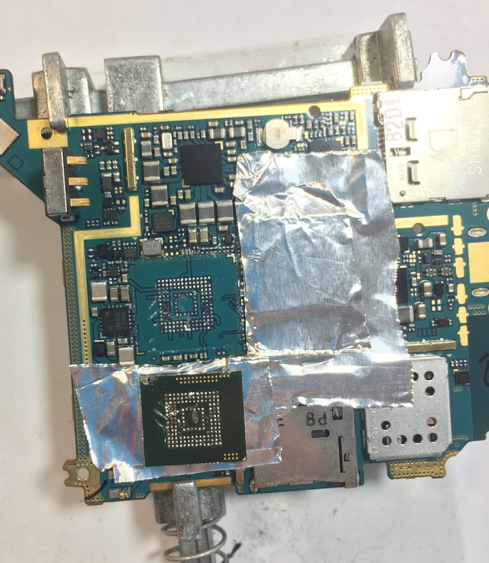 Будем менять на нем флешку. Закрываем все, что не хотим перегреть, фольгой-прилипалкой. Греем феном и аккуратно снимаем микросхему. Кто следит за постами, не будет удивлен нескольким отлетевшим пятакам на плате, как и на всех самсунгах - они не используются в схеме.