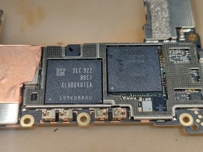 Выпаиваем процессор и оперативную память. Во времена этого ремонта, я еще по старой привычке, снимал и и основную микросхему памяти, в которой хранятся данные. Потому что тогда телефоны с UFS-памятью были еще редкостью и было желание слить дампов на всякий случай на будущее, раз уж аппаратец пришел в ремонт. С опытом стало понятно, что лучше не дышать в ее сторону лишний раз без необходимости.