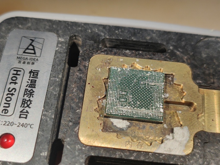 Можно приступить к рутинной и аккуратной работе. Кладем на подогрев процессор и очищаем его от компаунда и остатков предыдущих шаров