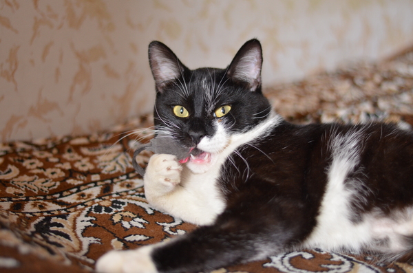 Сейчас эта морда прекрасно себя чувствует, любит похавать, поиграть, залипнуть на балконе в окно и поспать. Иногда приходит на руки полежать, помурчать, а потом слегка погрызть руки. Если увидит в зоне досягаемости какой-нибудь листок, то будет методично его ощипывать как леопард ощипывает свою добычу, так что важные бумаги от него нужно прятать.