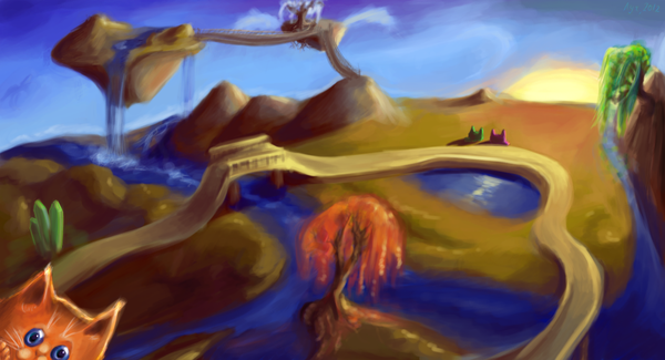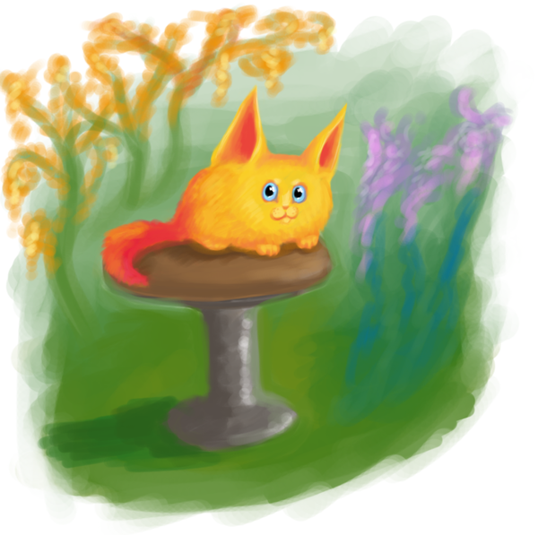 А кисёнок с цветком гуляли, гуляли, и вышли на одну большую поляну. Ну а на поляне этой — такая красотища! Ручеёк течёт, камушек лежит, а вокруг него песочек, повсюду цветы растут да ягоды. А на камне пухряндель Архимех сидит, щётку в лапах держит, хвостище свой вычёсывает и что-то на песке палочкой чертит. Понравилось цветку котовника это место, и говорит он кисёнку: