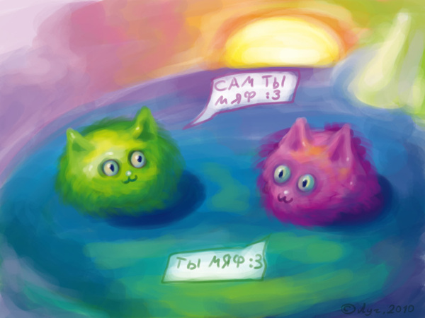 Облака на небе грохотали, сталкивались, периодически фыркали друг в друга молниями, и тут же разбегались, для приличия выдавая небольшую порцию дождя. Но тем, кто гулял, они, всё же, помешать не могли. Свет лучиками прорывался через раскиданный по небесам облачный мех и щекотал носы мяфам, созерцающим погоду этого дня.